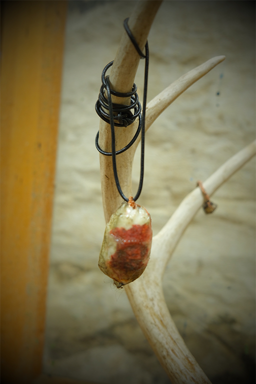 Man, 2025. Tumbled Bloodstone, gauze, hymns.